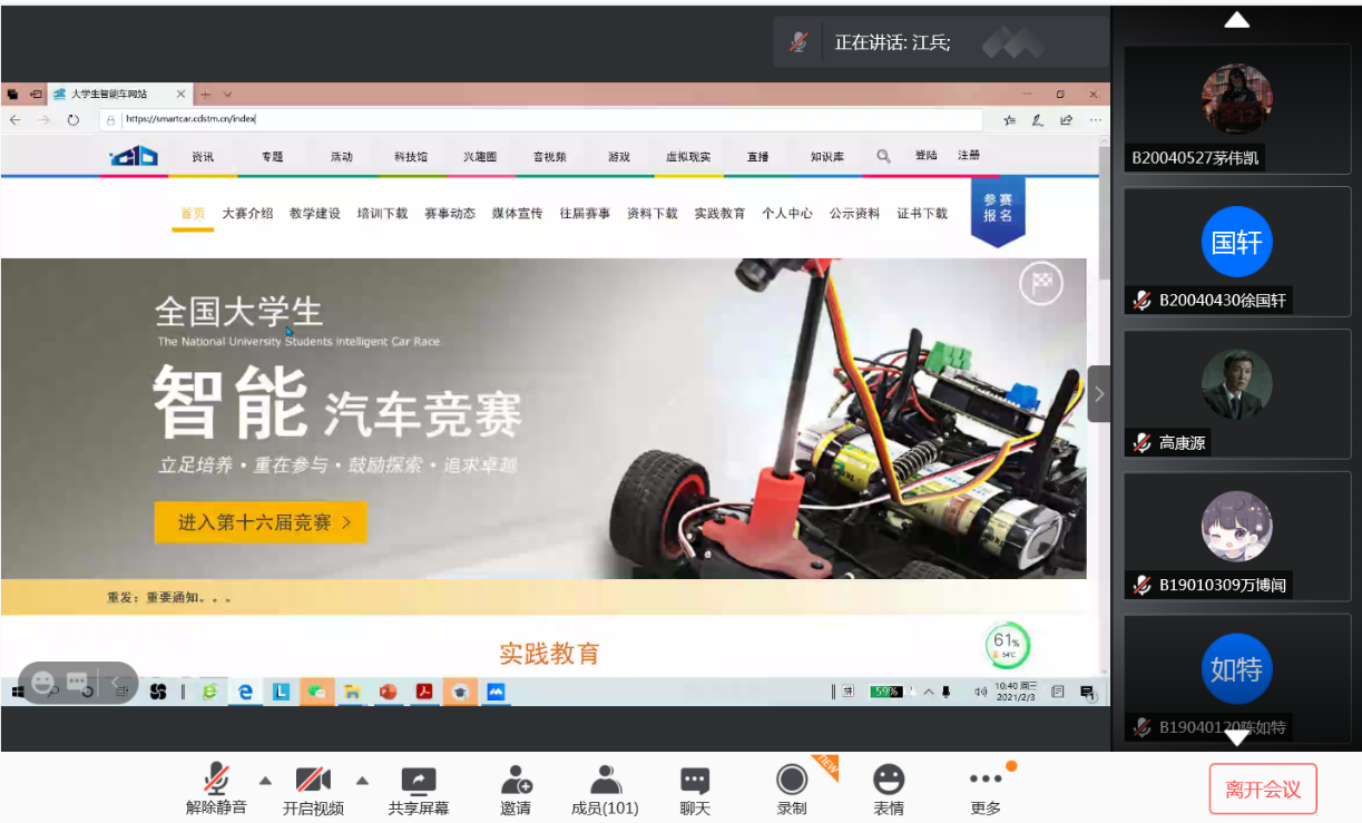为培养学生创新意识,营造浓厚的科技氛围,推进科技教育事业的发展,2月3日上午,我院2021年科技冬令营开营仪式于腾讯会议顺利举行。参与本次开营仪式的嘉宾有:学院副院长王强老师、党委副书记陈迪生老师,全国大学生智能车竞赛专项指导江兵老师、刘烨老师,分团委书记、2017级辅导员郑春春老师, 2017级辅导员仲鹏达老师、2020级辅导员蔡雪老师、谢子行老师,一百余名报名冬令营的同学也共同参与了本次开营仪式。