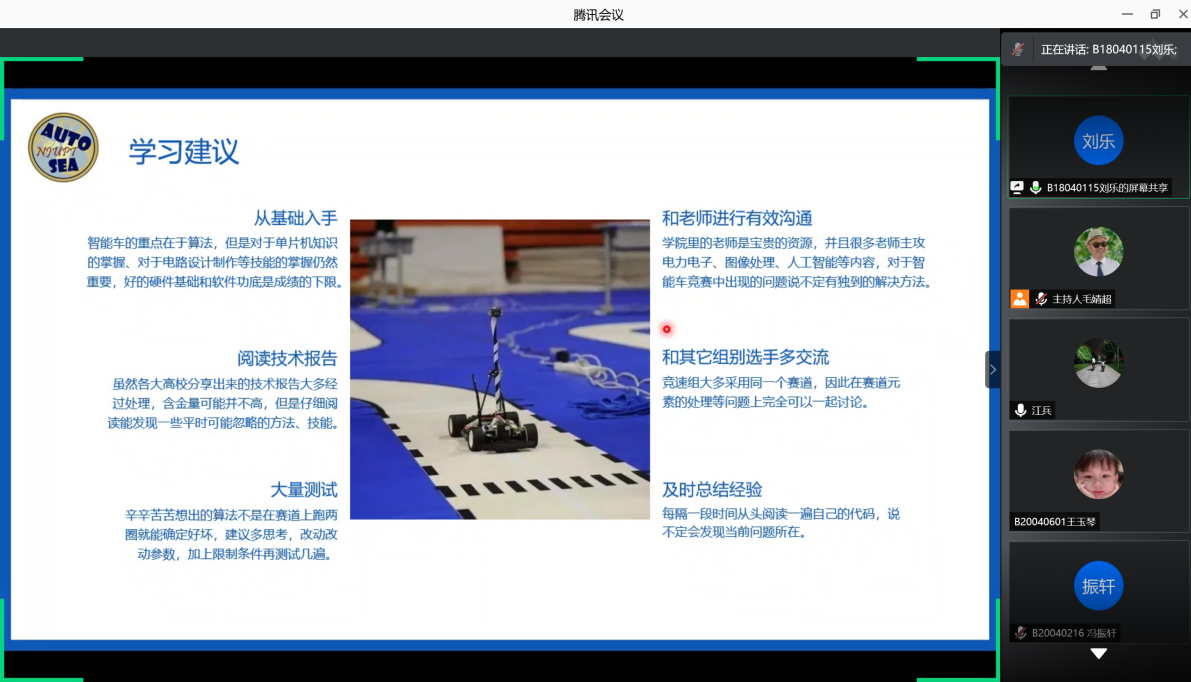 我院科学与技术协会社团主席刘乐同学作为竞赛经历丰富的学长,从参赛的角度对智能车竞赛的校内选拔、组队分工、团队协作、如何积极学习充分备赛等方面为同学们进行了详细的经验分享。