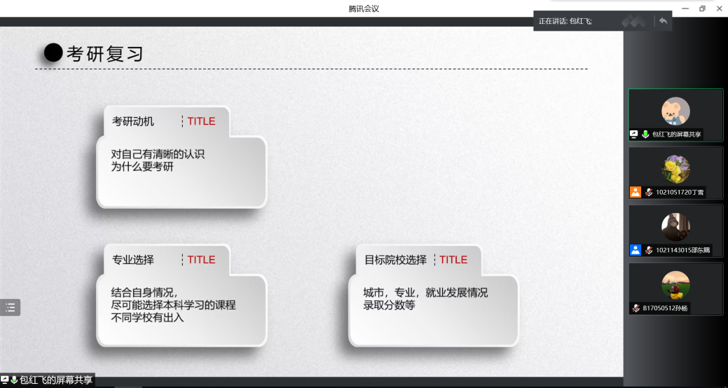 其次,包红飞学长则从确定考研目标、考研复习安排、考研复习、心态调整、复试准备这五大方面分享了自己的经验与心得。让同学们对考试科目有了更深入的了解,对复习时间安排有了更清晰的想法,在教材选择上也得到了有效的建议。