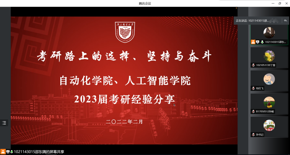 为拓宽我院2023届学子对考研信息获取,引导学生明确考研目标,增强自我规划能力,营造积极向上的良好学习氛围,自动化学院、人工智能学院于2月18日在线上举行了考研经验分享会。我院党委副书记、副院长孙委委老师莅临指导,我院2021届毕业生丁雪(现硕士研究生就读于南京邮电大学)、2021届毕业生孙杨(现硕士研究生就读于东南大学)、2021届毕业生包红飞(现硕士研究生就读于北京邮电大学)向2023届考研学子分享了宝贵经验。会议由2019级辅导员邵东隅老师主持。
