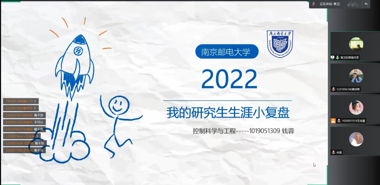 为切实帮助研一、研二全日制硕士更好地了解目前就业形势、解决就业困惑、做好职业生涯规划,自动化学院、人工智能学院于4月13日晚19点举办了“我的青春故事”线上就业经验分享会。本次活动的主讲嘉宾为我院2022届优秀毕业研究生代表钱蓉、黄卫、陈洪凯、徐森和蔡清媛5位同学。学院党委副书记兼副院长孙委委出席了本次活动,此次活动由学院2020级研究生辅导员余琪老师主持。