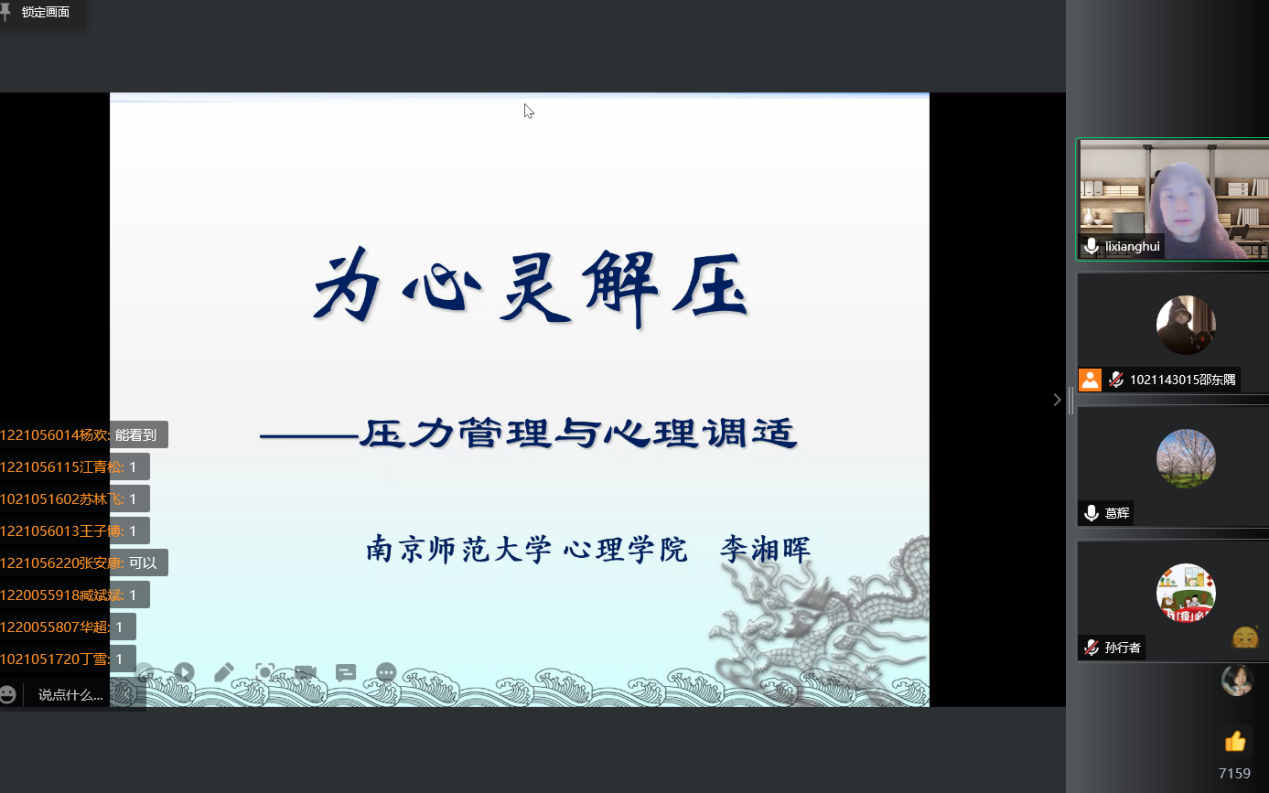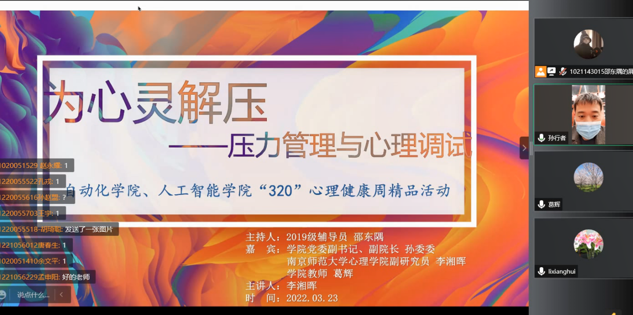 为普及心理健康知识,帮助大学生舒缓大学生活的压力,我院于3月23日晚开展“为心灵解压”主题线上讲座。本次活动邀请了南京师范大学心理学院副研究员李湘晖担任主讲,学院党委副书记兼副院长孙委委、电气系主任葛辉出席,活动由学院心理辅导员邵东隅主持,学院本科生、研究生共524人参与活动。